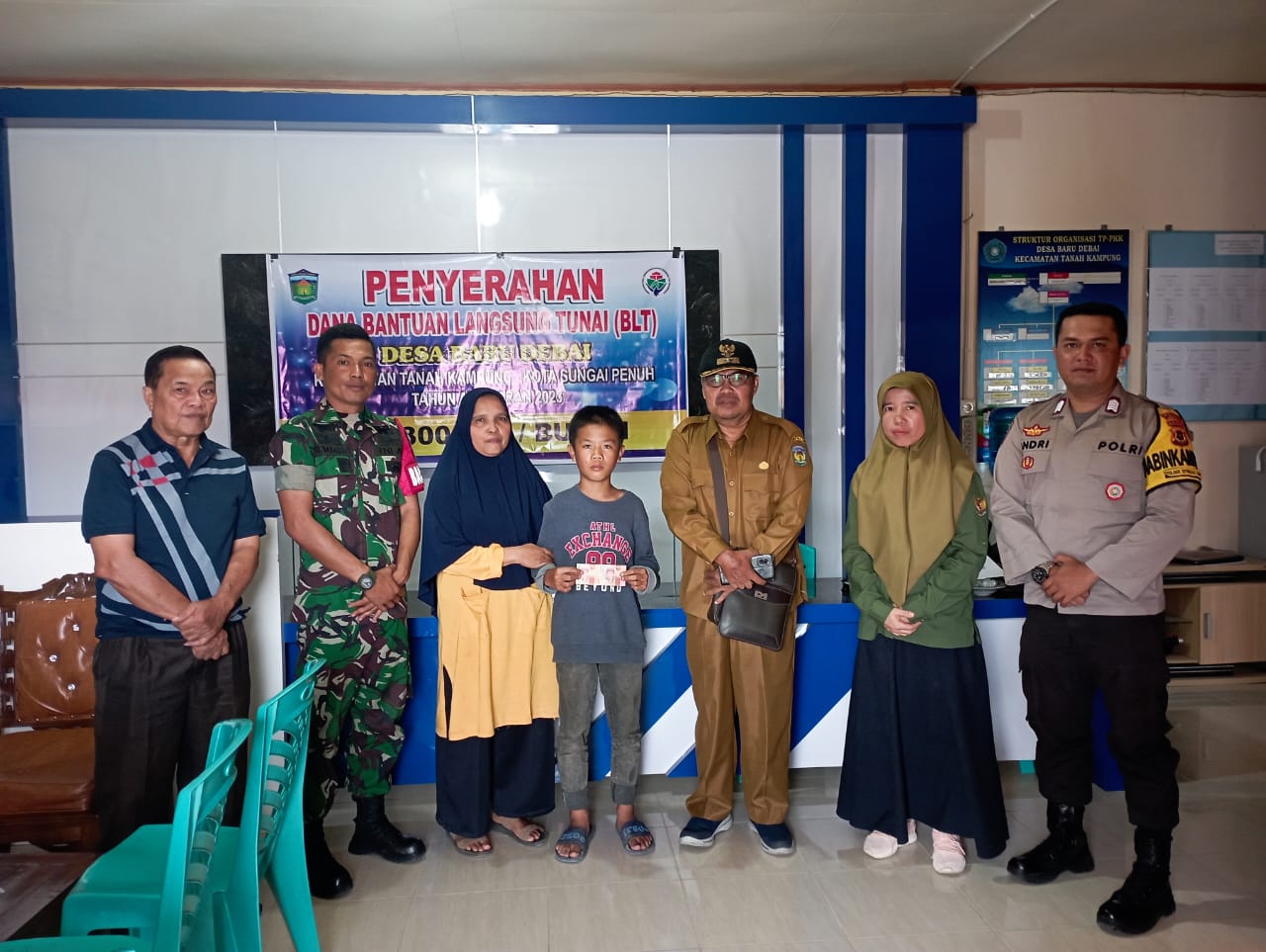 Pelaksanaan pembagian BLT dihadiri Babinsa, Babinkamtibmas, Ketua BPD, Aparatur Desa, Tokoh Masyarakat, seluruh Keluarga Penerima Manfaat Bantuan Langsung Tunai (KPM-BLT).