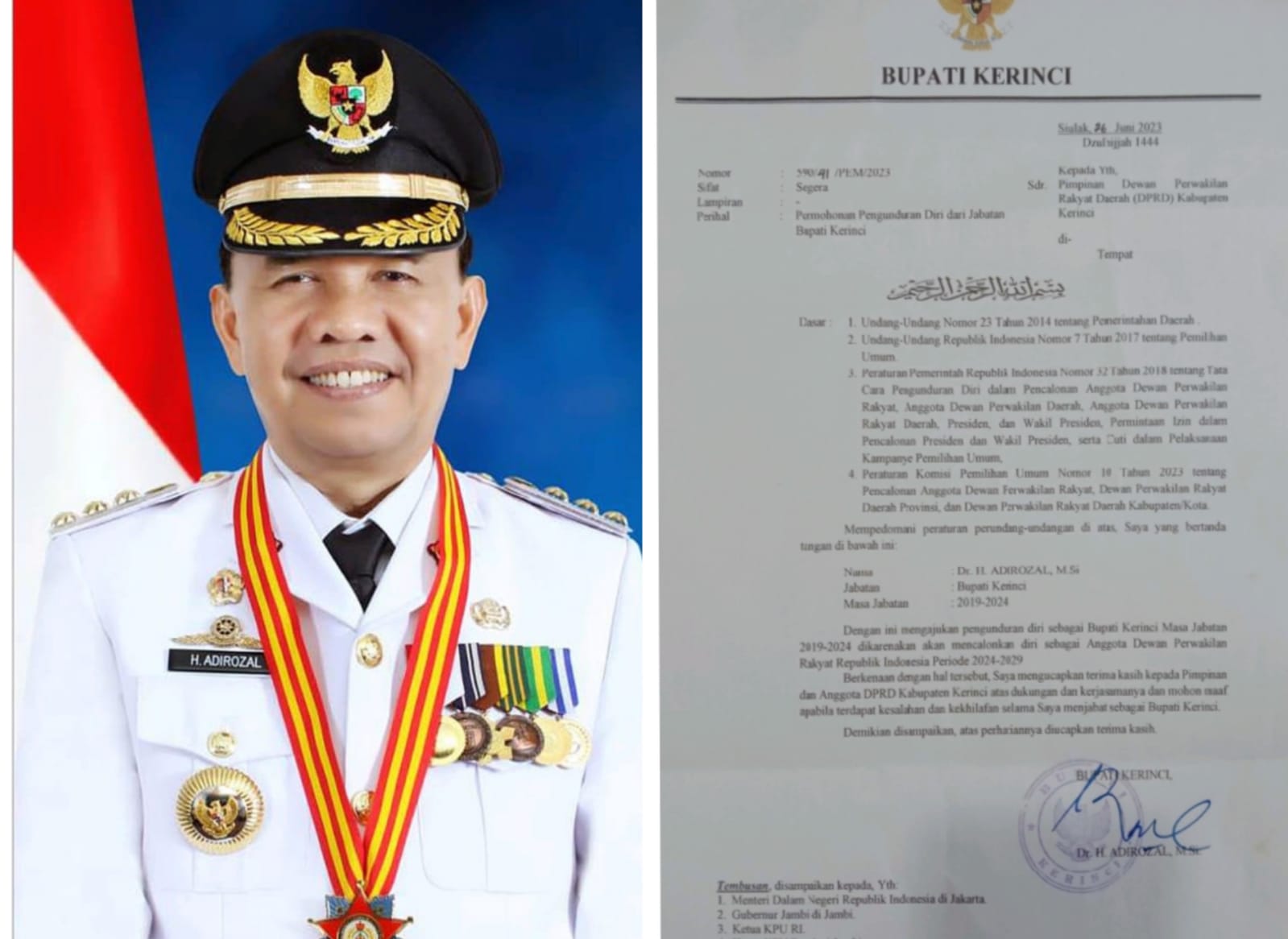 Setelah adanya surat tertulis yang diajukan Adirozal ke Dewan Perwakilan Rakyat Daerah (DPRD) Kabupaten Kerinci tertanggal 26 Juni 2023.