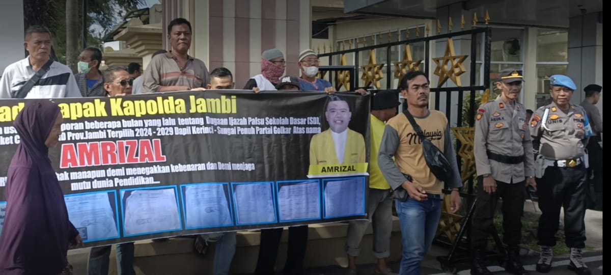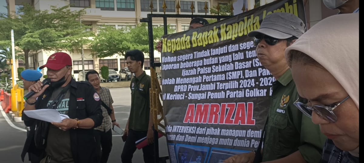 Sebelumnya para demonstran yang di pimpin oleh Ketua DPD LSM Kompej, Devry Boy, telah beberapa kali melakukan aksi unjuk rasa dibeberapa tempat termasuk di Mapolda Jambi dengan di lengkapi spanduk yang memuat gambar sebagai bukti dugaan dokumen palsu caleg Amrizal.