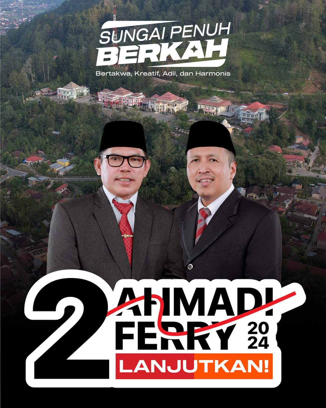 SUNGAIPENUH– Nampaknya Motto Lanjutkan 2 Periode sangat cocok untuk pasangan Calon Walikota dan wakil walikota, Ahmadi Zubir-Ferry Satria (AZ-FER), periode 2024-2029.