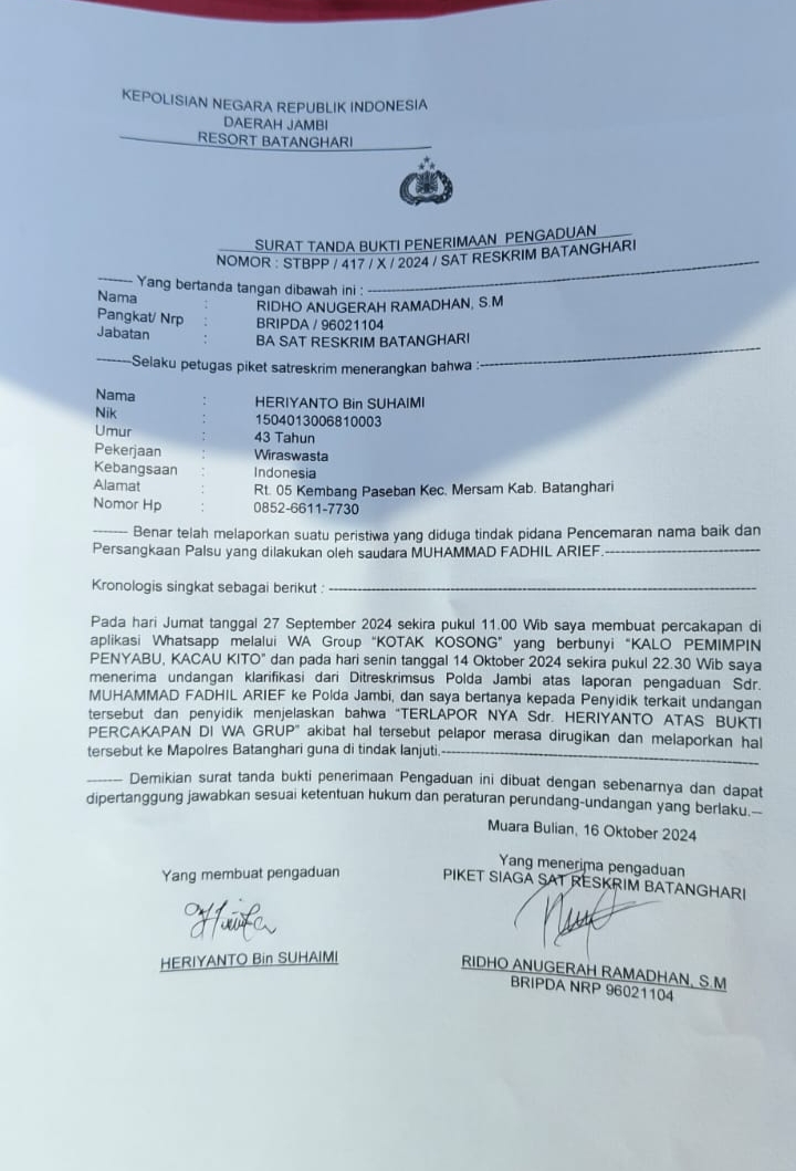 Presisi jambi. Com Berita Batanghari untuk- Seorang warga Mersam yang merupakan wartawan berinisial HR kembali melaporkan balik Muhammad Fadil Arief ke Markas Polisi Restor (Mapolres) Batanghari. Pasalnya, sebelumnya Muhammad Fadil Arief juga melaporkan HR ke Mapolda Jambi terkait dengan dugaan tindak pidana sebagai mana yang dimaksud dalam pasal 27A Jo Pasal 45A ayat (4) Undang-undang nomor 1 Tahun 2024, tentang informasi dan transaksi elektronik yang di laporkan olehnya.