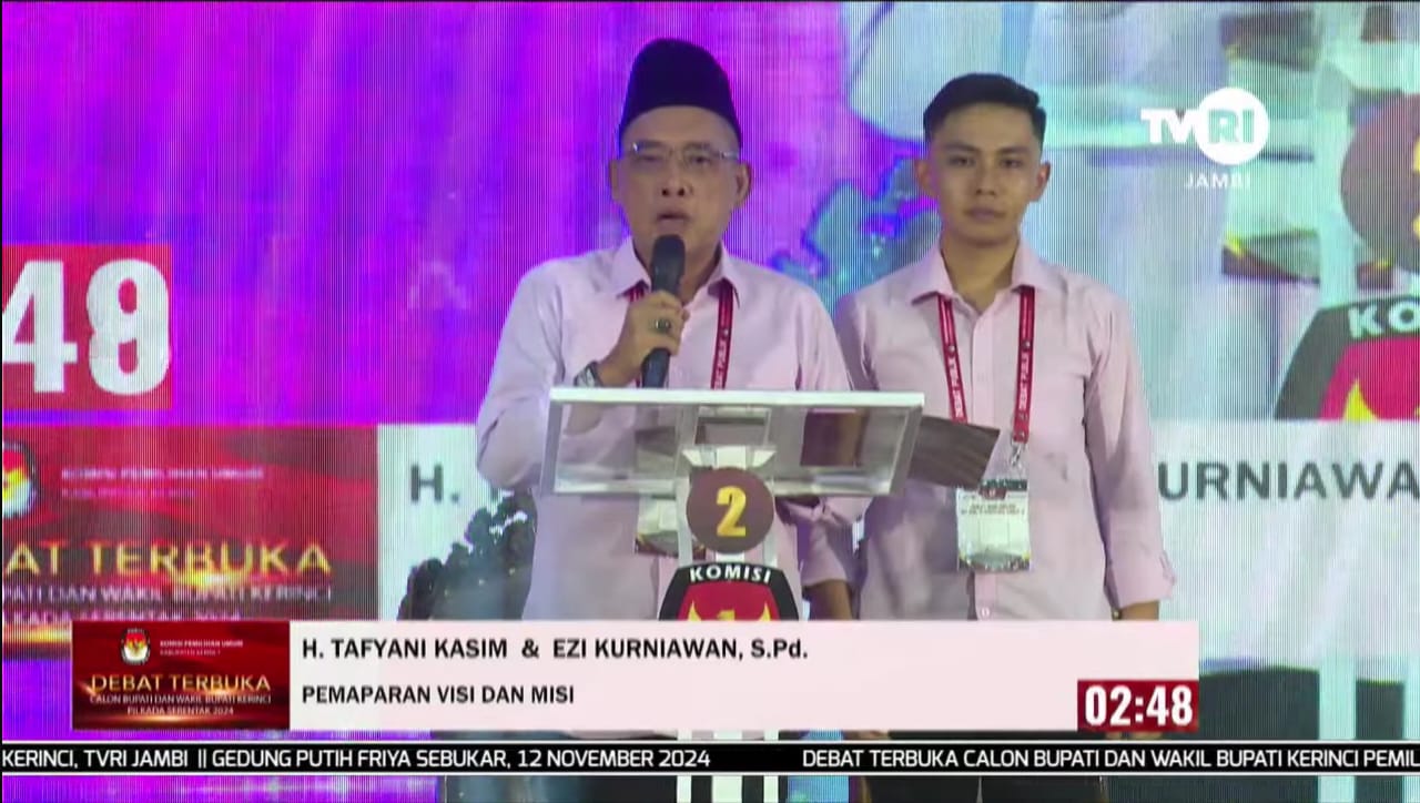 KERINCI – H Tafyani Kasim (HTK) – Ezi Kurniawan mengawali Debat Terbuka Pasangan Calon Bupati dan Wakil Bupati Kerinci tahun 2024 dengan menyampaikan visi misi menuju Kerinci IMPIAN, Selasa (12/11/2024) malam ini.