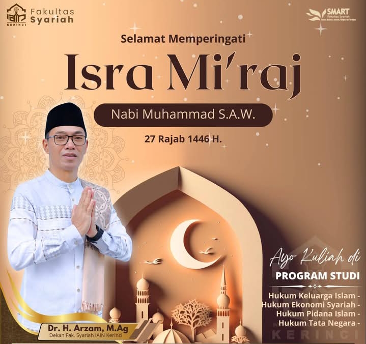 Presisijambi.com – Dekan Dr. H. Arzam, M.Ag, bersama Civitas Akademika Fakultas Syariah IAIN Kerinci, mengucapkan selamat memperingati Isra Mi’raj Nabi Muhammad SAW, yang jatuh pada 27 Rajab 1446 H / 27 Januari 2025.