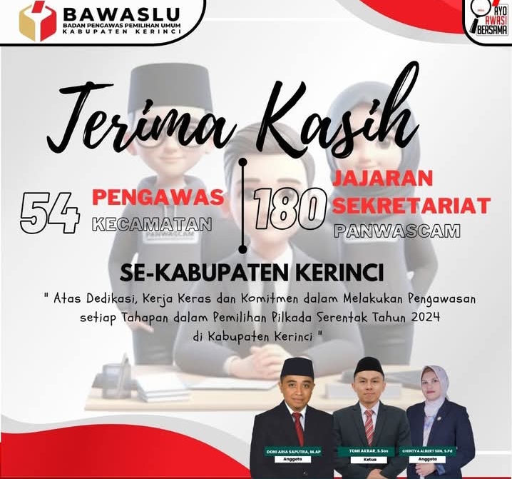 Hal tersebut disampaikan langsung oleh Ketua Bawaslu Kabupaten Kerinci Tomi Akbar, Selasa (28/1/2025), “Terimakasih Kepada 54 Panwascam dan 180 Jajaran Sekretariat Panwascam yang ada di Kabupaten Kerinci, Atas dedikasinya, kerja keras dan komitmen dalam melakukan pengawasan setiap tahapan dalam pemilihan Pilkada Serentak 2024 di Kabupaten Kerinci,”ucap Ketua Bawaslu Kabupaten Kerinci Tomi Akbar.