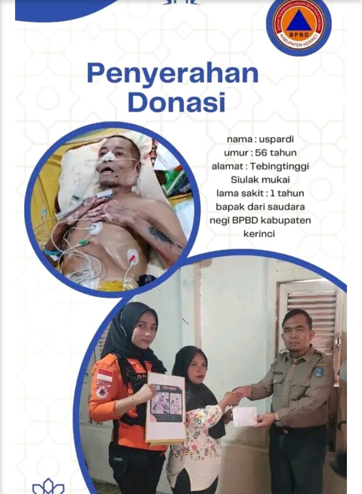 Kalak BPBD Dedi juga menghimbau kepada dermawan yang ada di Kabupaten Kerinci dan Kota Sungaipenuh untuk menyisihkan sebagian rezeki kita untuk meringankan beban biaya pengobatan dari orang tua saudara kami yang terbaring sakit di rumah sakit umum M Jamil Padang.