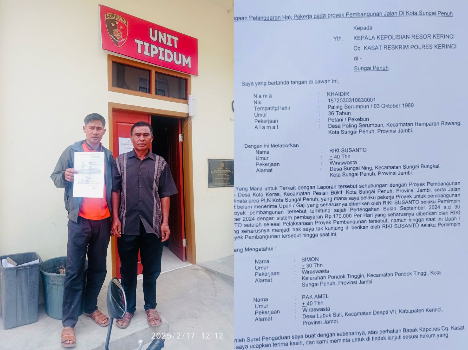 Dalam surat laporan yang dituju ke Polres Kerinci, terdapat 13 tukang gaji atau upah mereka belum dibayar dengan gaji perhari 170 Ribu dengan jumlah hari yang berbeda.
