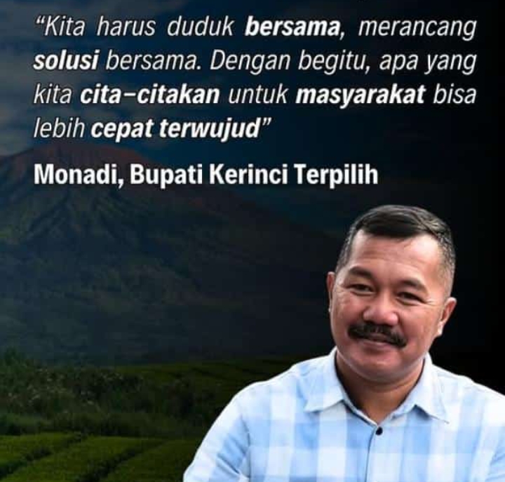 Explorenews.net Kerinci – Monadi secara resmi terpilih sebagai Bupati Kerinci, membawa harapan baru bagi masyarakat daerah tersebut. Dalam sebuah pernyataan, Monadi menegaskan komitmennya untuk bekerja sama dengan semua pihak guna mewujudkan cita-cita pembangunan daerah.