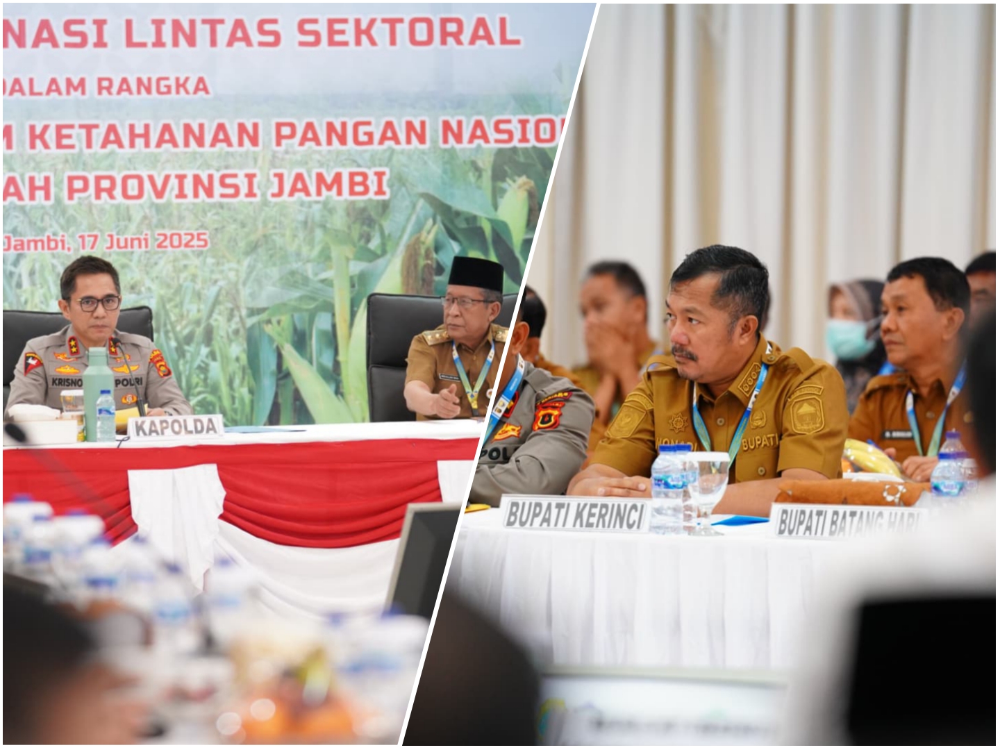 JAMBI – Selasa, 17 Juni 2025 — Bupati Kerinci, Monadi, S.Sos., M.Si., menghadiri Rapat Koordinasi (Rakor) Lintas Sektoral dalam rangka mendukung program ketahanan pangan nasional, khususnya peningkatan produksi komoditas jagung di wilayah Provinsi Jambi. Kegiatan ini dilaksanakan di Aula Gedung Siginjai, Polda Jambi, dan dipimpin langsung oleh Kapolda Jambi, Irjen. Pol. Drs. Krisno Halomoan Siregar, S.I.K., M.H.