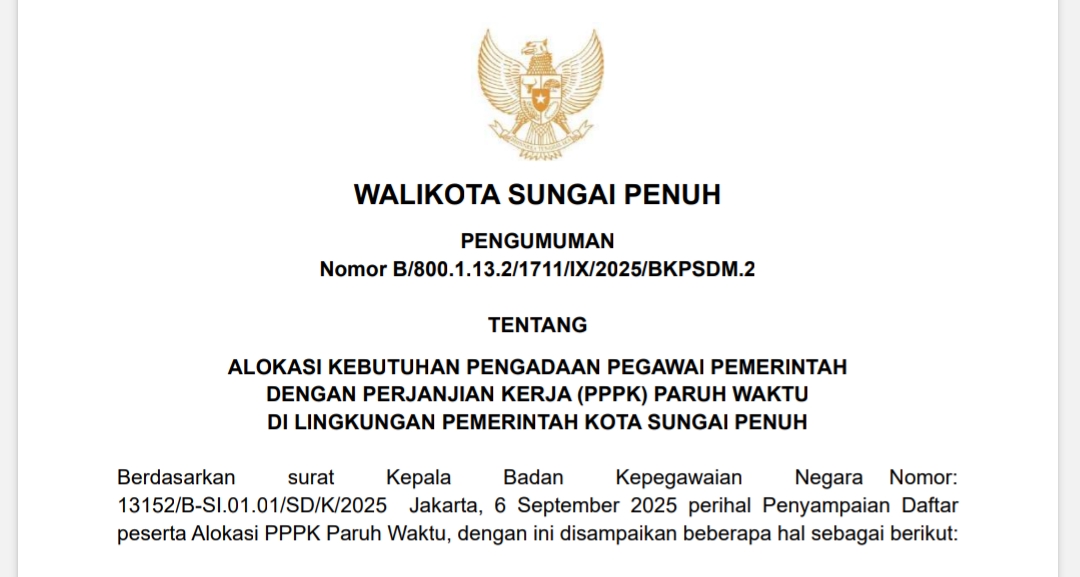 SUNGAIPENUH – Pemerintah Kota Sungai Penuh secara resmi merilis hasil seleksi Pegawai Pemerintah dengan Perjanjian Kerja (PPPK) Paruh Waktu melalui surat pengumuman bernomor B/800.1.13.2/1711/IX/2025/BKPSDM.2.