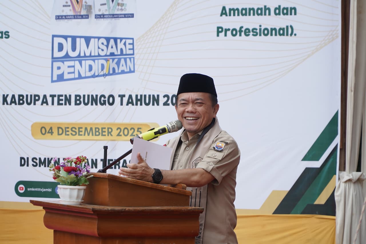 BUNGO – Gubernur Jambi, Dr. H. Al Haris, S.Sos., M.H., menegaskan bahwa generasi muda merupakan aset penting negara yang harus dipersiapkan secara serius melalui peningkatan kualitas sumber daya manusia (SDM). Penegasan itu ia sampaikan saat menyerahkan bantuan pendidikan program Dumisake sekaligus meresmikan SMK Negeri Titian Teras Bungo dan melantik siswa-siswi baru, Kamis (04/12/2025).