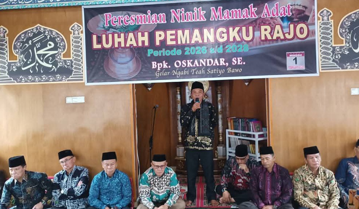 SUNGAIPENUH – Sekretaris Daerah Kota Sungai Penuh, Alpian, SE, MM, menghadiri prosesi peresmian Ninik Mamak Adat Luhah Pemangku Rajo untuk masa bakti 2026–2028 di Musala Nurul Ikhlas, Minggu (1/2). Pada kesempatan itu, Oskarndar, SE, resmi dikukuhkan dengan gelar adat Ngabi Teah Satiyo Bawo.