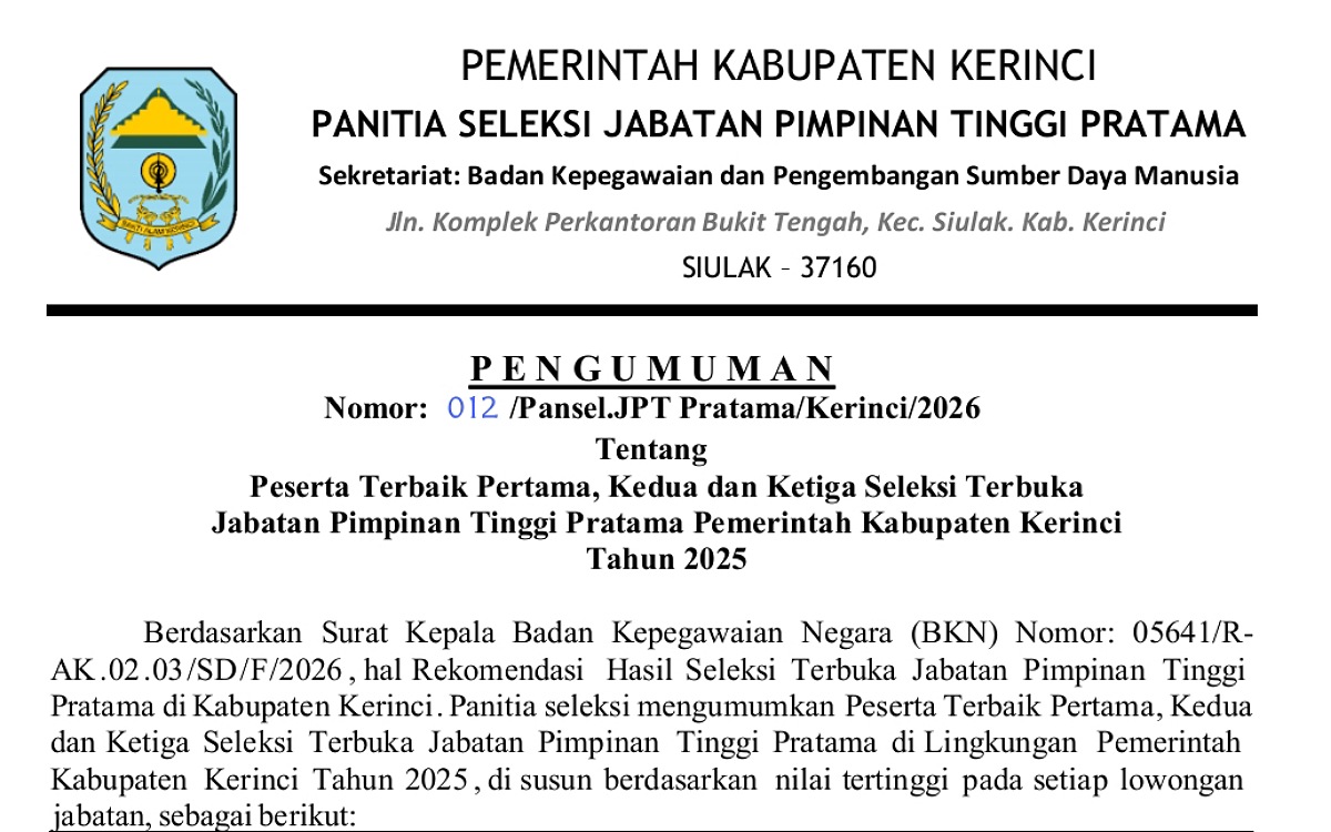Pengumuman tersebut tertuang dalam surat bernomor 012/Pansel.JPT Pratama/Kerinci/2026 yang diterbitkan di Siulak, Februari 2026.